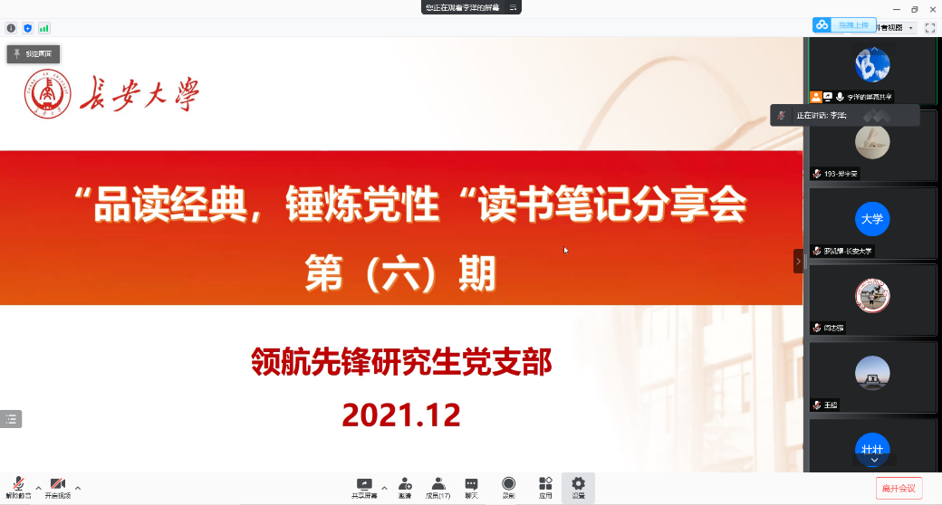 为了加强支部成员的思想道德建设,弘扬崇高的革命精神和文化氛围,2021年12月31日下午15:00,51吃瓜 领航先锋党支部组织支部成员线上开展了第六期读书笔记分享活动,本次活动由支部成员罗凯耀同志和王鑫鑫同志做读书笔记分享。支部全体党员参加了此次活动。
