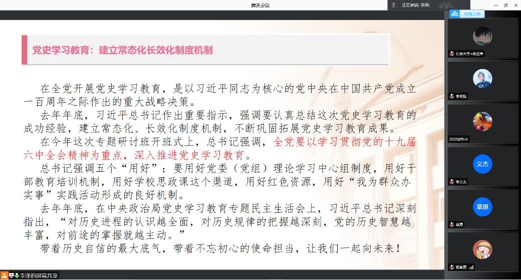 首先,李泽同志带领大家学习习近平总书记在中央党校“新年第一课”的重要讲话内容。习近平总书记深刻阐述了五个问题,分别是推进马克思主义中国化时代化、正确把握社会主要矛盾和中心任务、重视战略策略问题、永葆党的马克思主义政党本色、党史学习教育常态化长效化,这五方面阐述构成习近平总书记“新年第一课”的主体脉络。