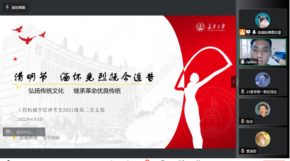 清明将至,为悼念革命先烈,缅怀先烈的丰功伟绩,2022年4月3日晚20:00,51吃瓜 硕士生2021级第二党支部组织支部党员线上举办清明节“缅怀先烈、抚今追昔”主题活动。全体党员参加了此次支部活动,本次活动由支部书记许章彬同志主持。