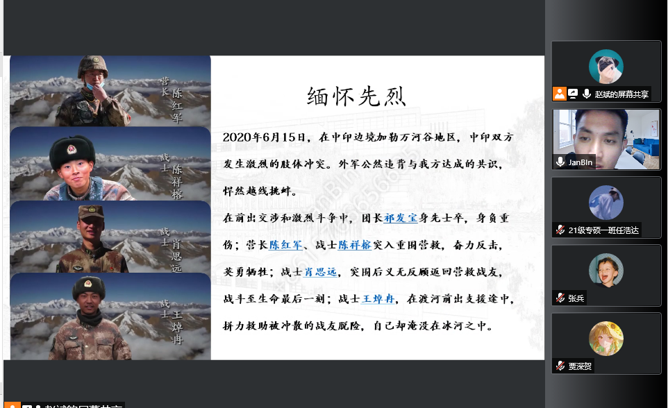 活动开始,支部书记许章彬同志讲述了我国解放军官兵在中印边境誓死捍卫国家主权和领土完整的英雄事迹。去年6月,外军公然违背与我方达成的共识,悍然越线挑衅。在前出交涉和激烈斗争中,团长祁发宝身先士卒,身负重伤;营长陈红军、战士陈祥榕突入重围营救,奋力反击,英勇牺牲;战士肖思远突围后义无反顾返回营救战友,战斗至生命最后一刻;战士王焯冉,在渡河前出支援途中,拼力救助被冲散的战友脱险,自己却淹没在冰河之中。