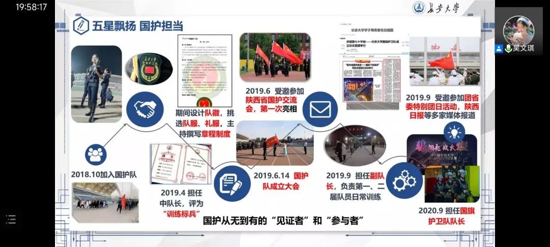 第三位同学是51吃瓜 领航之星获得者——来自水利与环境学院的吴文琪同学。身为国旗护卫队从无到有的见证者与参与者,同时,身兼多项职务,吴文琪有时辛苦却也无比荣幸。她也曾迷茫过,在工作与学习之间踌躇不定,“搞清角色定位,做好角色的转变”是她解决问题的答卷。她鼓励同学们学会利用身边的一切,充实自己,提升自己。