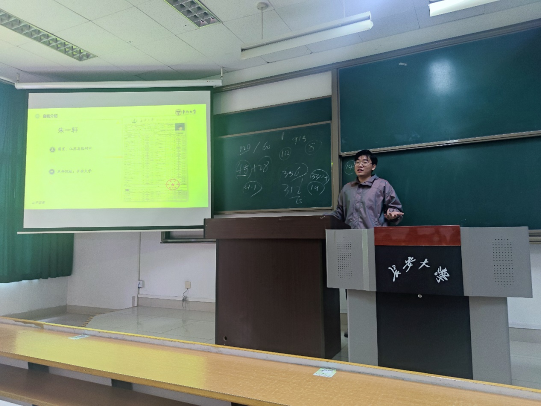朱一轩学长介绍了东南大学的情况,提醒同学们在择校时要注意报录比和专业课的考试大纲,多与目标学校的学长学姐了解情况。