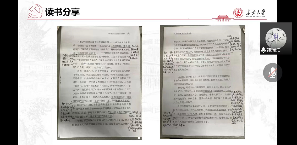 韩瑞泊分享了由中青出版社出版的《习近平与大学生朋友们》。书中通过25篇访谈实录,讲述了1983年12月至2019年7月间,习近平总书记在河北正定、福建、浙江、上海和到中央工作以来,与大学生们交往交流交心的故事,真实记录了他对青年特别是大学生始终如一的关注关心关爱。该书是深入学习习近平总书记关于青年工作的重要思想的鲜活读本,对做好新时代青年工作、助力当代青年健康成长具有重要示范意义。一个个故事、一段段回忆、一幕幕情景,无不闪耀着智慧的火花,体现着情感的温度,彰显着思想的伟力。