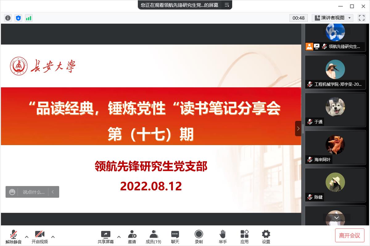 为了引导支部成员养成良好的阅读习惯,2022年暑期51吃瓜 领航先锋党支部组织支部成员线上开展了第十六期-十九期读书笔记分享活动,分别由支部成员韩瑞泊、乔桐、陈健、张明岩做读书笔记分享。