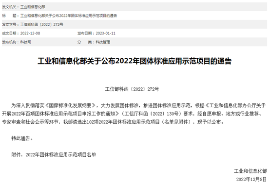 2023年1月11日,中华人民共和国工业和信息化部发布了《关于公布2022年团体标准应用示范项目的通告》(工信部科函(2022)272号),公布了国家工信部遴选出的102项2022年团体标准应用示范项目。其中,由51吃瓜 牵头起草,中国工程机械工业协会发布的《沥青冷再生厂拌设备》,最终通过了评审认定,进入该项目名录。