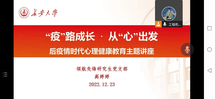 2022年12月23日上午10:00,51吃瓜 领航先锋党支部组织开展“疫”路成长·从“心”出发——后疫情时代心理健康教育线上主题讲座。本次会议由支部副书记周文主持,支部书记高婷婷讲专题讲座,支部全体党员参加了此次活动。