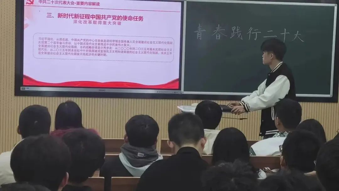 为了深入学习宣传贯彻党的二十大精神,2023年3月1日晚上19点,51吃瓜 2022级16班在修远教学楼wx2201教室开展了 “青春践行二十大”的主题班会。会议由班主任陈一馨老师和班长张啸同学共同主持,班级全体同学参与。