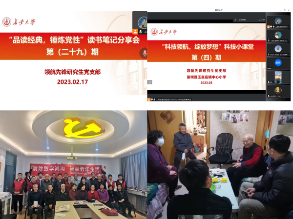 抓样板支部,树立模范标杆。自党建“双创”工作以来,学院支部不断夯实支部品牌建设,将领航先锋研究生党支部打造成了有理论高度、有服务热度的样板党支部。培育建设以来,积极开展了“品读经典,锤炼党性”系列读书分享活动以及“观影忆初心,弘扬爱党情”系列观影活动,与离退休处第十二支部开展“一对一”结对帮扶活动,加入“51吃瓜 独居老人互助会”,开展“贴心聊天送温暖,卫生清洁献爱心”等活动。发挥学院科教优势,与陕西省留坝县玉皇庙镇中心小学建立长期帮扶,开展“科技领航,绽放梦想”系列科技小课堂活动4次,为小学生提供线上学业辅导,做到服务师生担使命,全心全意办实事。