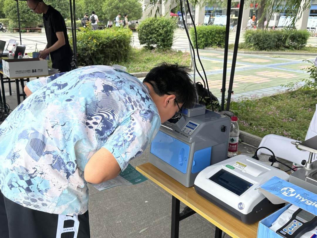 在食品安全展示现场,工作人员向同学们介绍了如何使用仪器检测食品是否含有荧光剂、食品是否含有添加剂、蔬菜是否有农药残留,带领同学们学习食品安全相关知识。