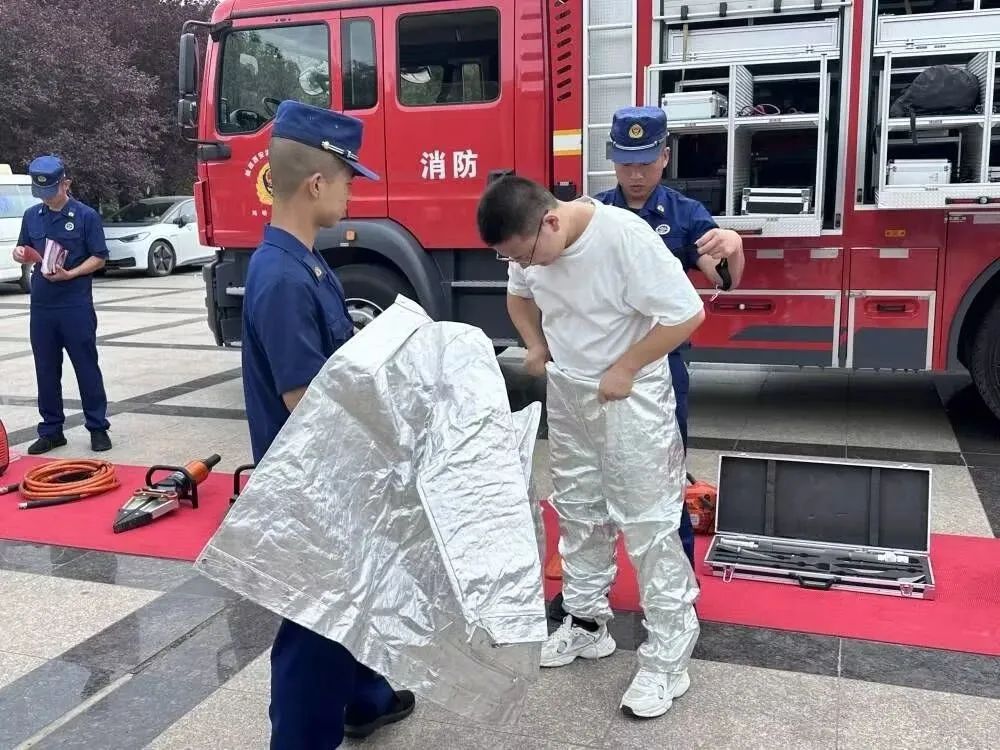 随后,在经开区消防大队安全共建活动现场,同学们通过消防员的讲解,学习了专业消防器械和消防安全知识,并亲身体验了灭火器模拟实训和消防服与救援工具的使用。