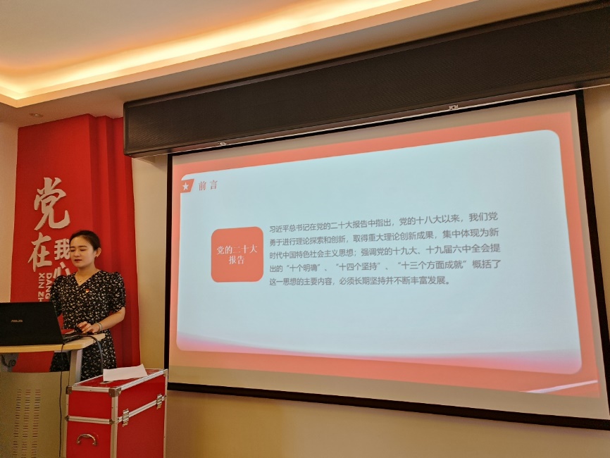 会议上,高婷婷围绕习近平新时代中国特色社会主义思想的主要内容、把握好习近平新时代中国特色社会主义思想的世界观和方法论、习近平新时代中国特色社会主义思想是坚持“两个结合”的最新理论成果三个方面展开讲解,指出了习近平新时代中国特色社会主义思想是党和国家必须长期坚持的指导思想,是系统完备的科学体系,是全党全国人民为实现中华民族伟大复兴而奋斗的行动指南。