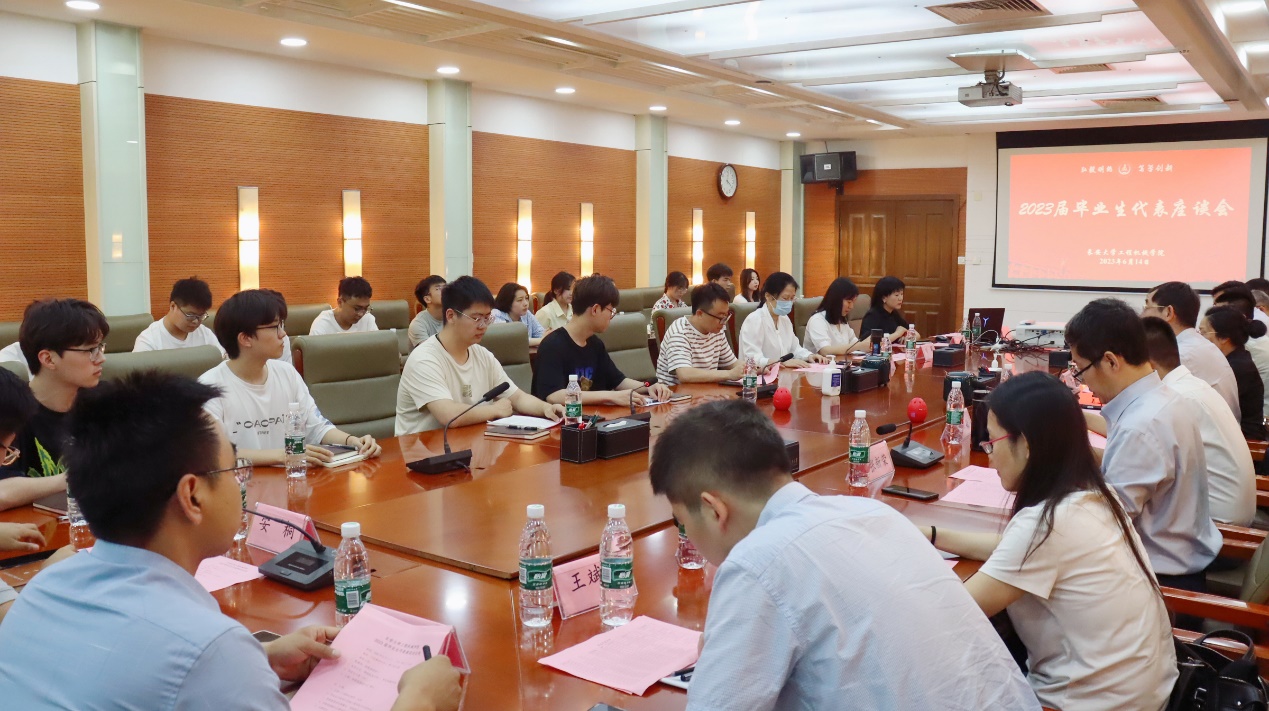 在北辰楼第二会议室召开2023届毕业生代表座谈会。学院党委书记高雁北、院长叶敏、党委副书记李勉、副院长张新荣、副院长张春国、各系主任、教学主管、学办主任、团委书记、毕业班辅导员与20位毕业生代表面对面进行座谈,共同聆听毕业生们的发展去向及对学院发展的意见与建议。座谈会由学院党委副书记雷剑主持。