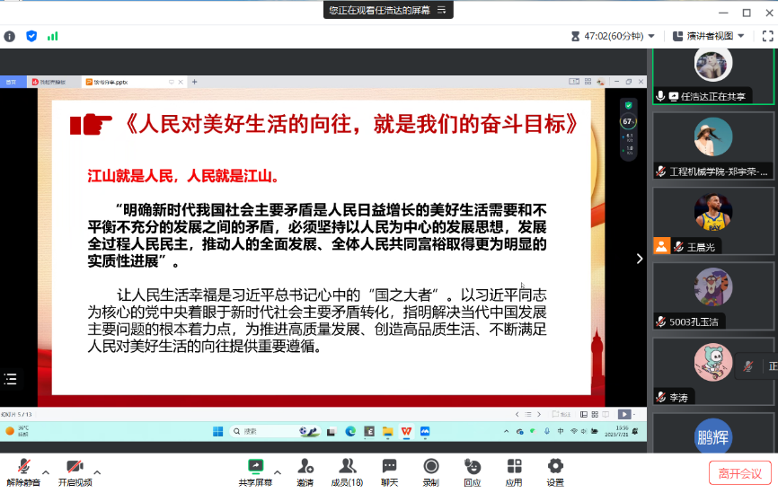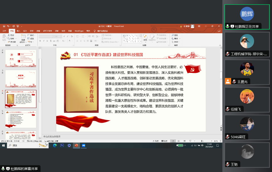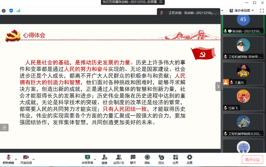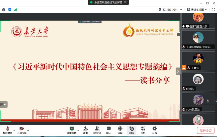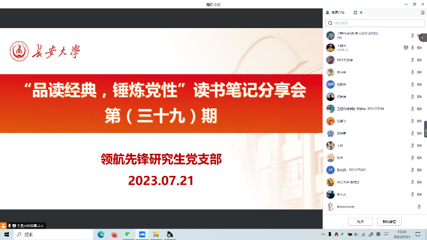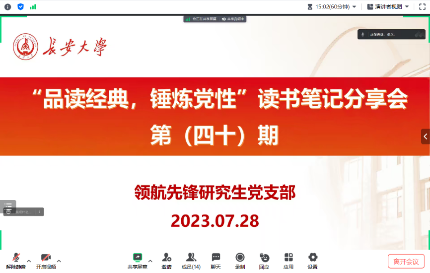 2023年7月14日上午,51吃瓜 领航先锋研究生党支部组织支部成员线上开展了第三十八期“品读经典,锤炼党性”读书分享活动,本次读书分享活动对照支部主题教育学习安排,由支部成员任浩达、任锦飞领学。