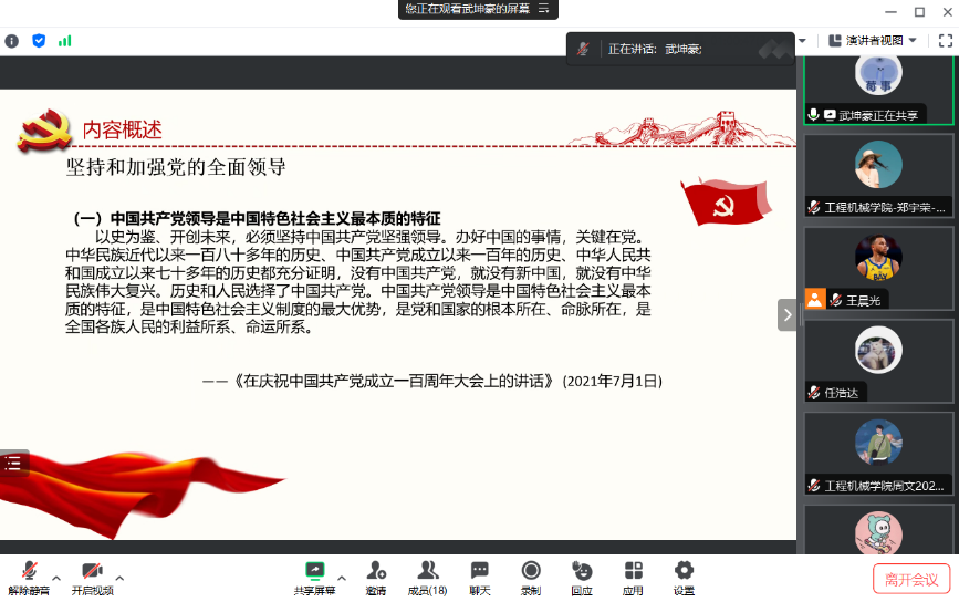 武坤豪强调:我们要坚持党的全面领导,我深刻地认识到作为党员的我们应该坚定不移地贯彻党是领导一切的。要树牢信仰之基,汲取奋进之力。身为当代青年的我们最重要的是从当下做起,要提高自身修养,将个人的命运与国家的命运紧紧联系在一起。只有做好自己该做的事,才能在将来更好地为党和国家奉献自己的一份力量。