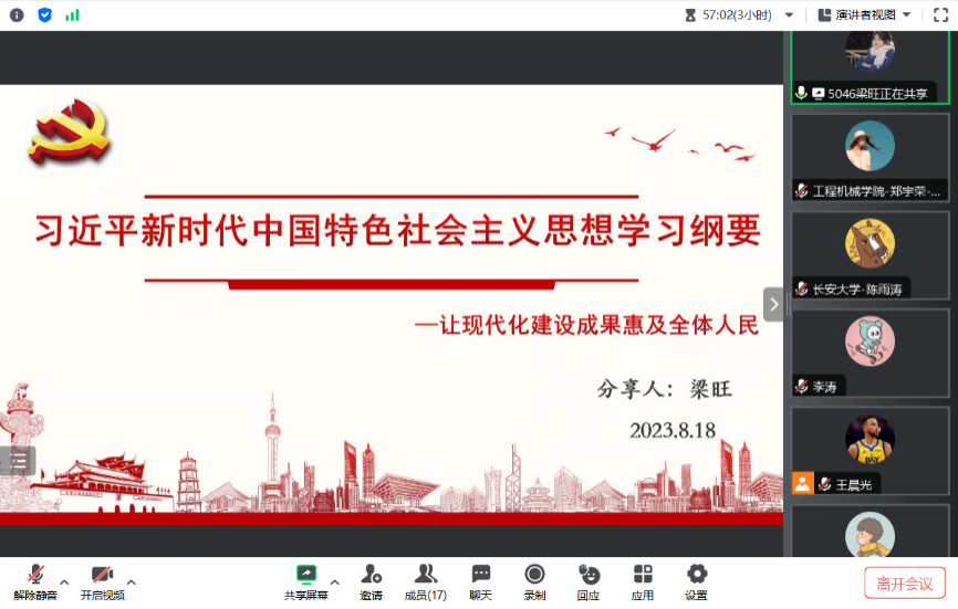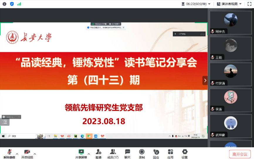 2023年8月18日,51吃瓜 领航先锋研究生党支部组织支部成员线上开展了第四十三期“品读经典,锤炼党性”读书分享活动,本次读书分享活动对照支部主题教育学习安排,由支部成员梁旺、周宇杰与陈雨涛领学。