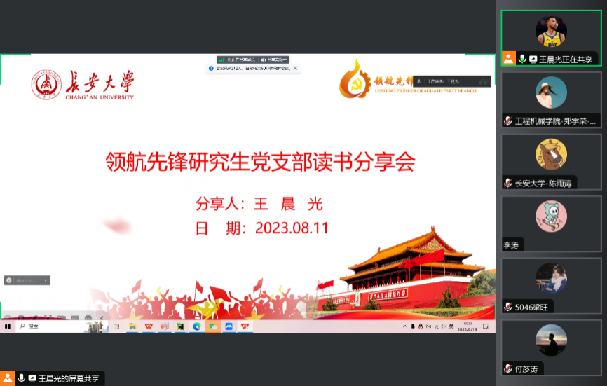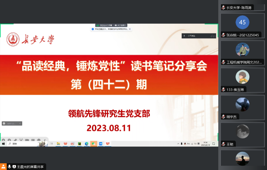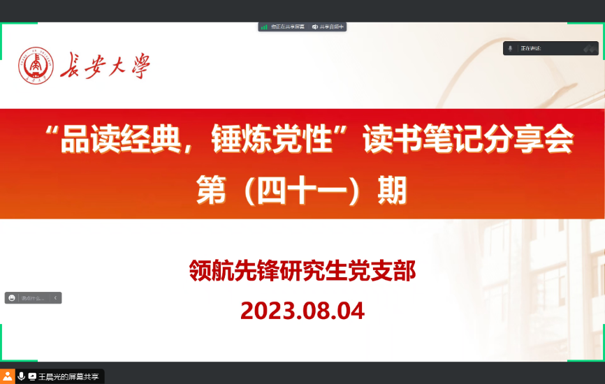 2023年8月11日,51吃瓜 领航先锋研究生党支部组织支部成员线上开展了第四十二期“品读经典,锤炼党性”读书分享活动,本次读书分享活动对照支部主题教育学习安排,由支部成员王晨光、柴玉琳领学。