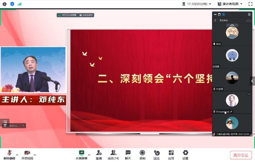 2023年7月28日,51吃瓜 领航先锋研究生党支部组织支部成员线上观看了【深入开展学习贯彻习近平新时代中国特色社会主义思想主题教育】第五讲——由中国社会科学院马克思主义研究院原党委书记/院长邓纯东专题解读——《如何深刻领会“两个结合”“六个坚持”》。支部党员参加了此次活动,本次活动由支部组织委员王晨光主持。
