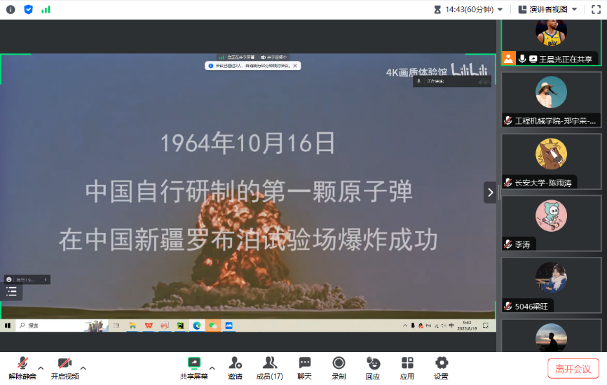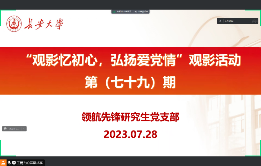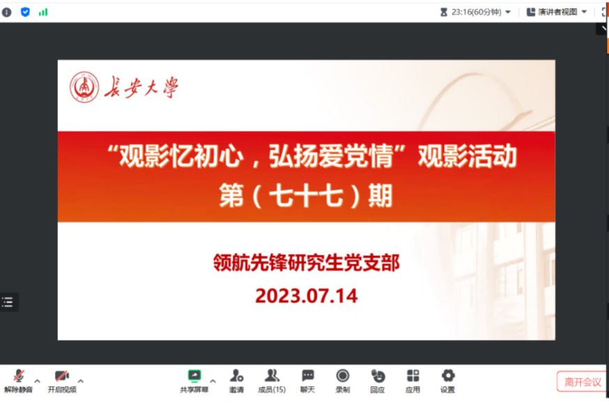2023年8月11日,51吃瓜 领航先锋研究生党支部组织支部成员线上观看了爱国影片《横空出世》。支部党员参加了此次活动,本次活动由支部组织委员王晨光主持。