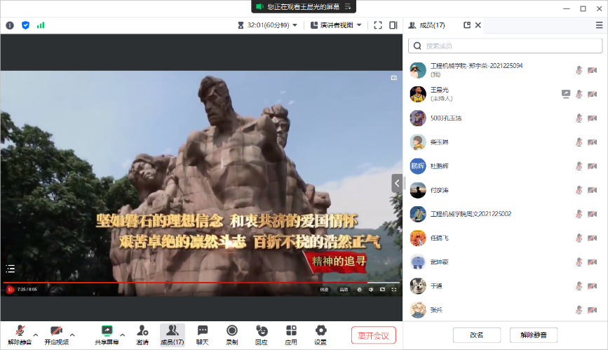 为深入开展学习贯彻习近平新时代中国特色社会主义思想主题教育,传承中国共产党人的精神谱系,2023年7月14日,51吃瓜 领航先锋研究生党支部组织支部成员线上观看了共产党员网推出的微视频《精神的追寻——红岩精神》。支部党员参加了此次活动,本次活动由支部组织委员王晨光主持。