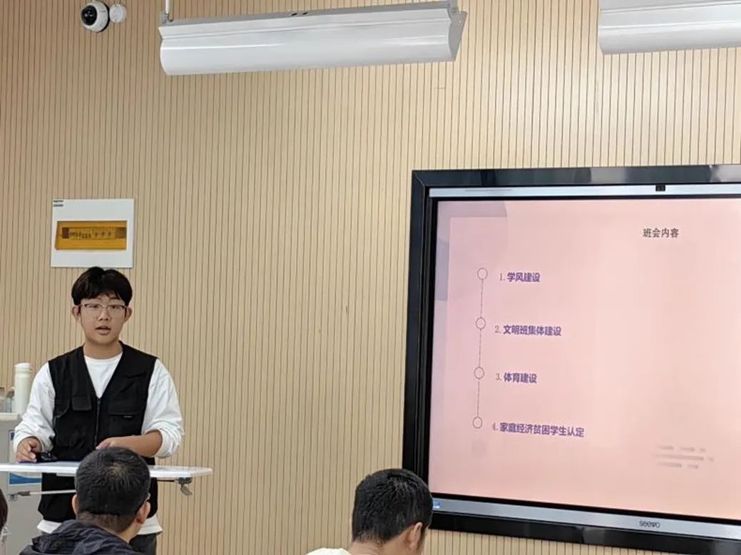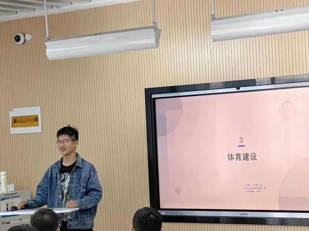 接下来文体委员刘鸣宇就体育建设方面,首先强调了保持身体健康的重要性,督促大家保质保量完成“乐跑”活动。同时给大家详细介绍了即将开展的体测项目,并给同学们分享了切实有用的经验,争取实现班级全员合格的目标。