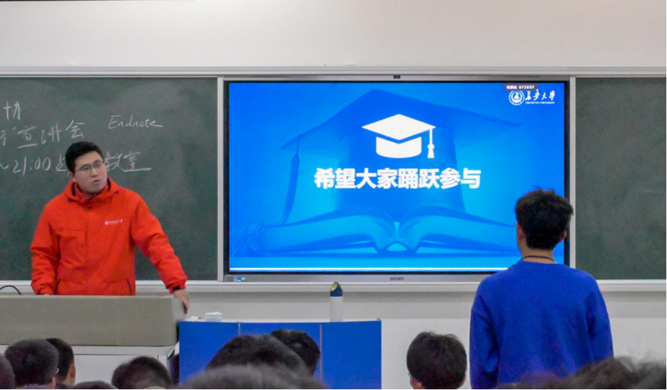 晚7点整,宣讲会准时开始。首先,由封硕老师致辞,他从比赛意义和对大学生的能力培养两方面讲述了“挑战杯”比赛的重要性,鼓励同学们积极参加比赛。随后,封硕老师讲解本次大赛的相关内容。封老师主要从赛事介绍进行讲解。通过介绍大赛的基本赛程、材料报送、评审规定和本届“挑战杯”比赛的具体参赛要求等相关内容,帮助同学们深入了解比赛。同学们认真聆听,详细记录,展现出对“挑战杯”比赛的极高热情。
