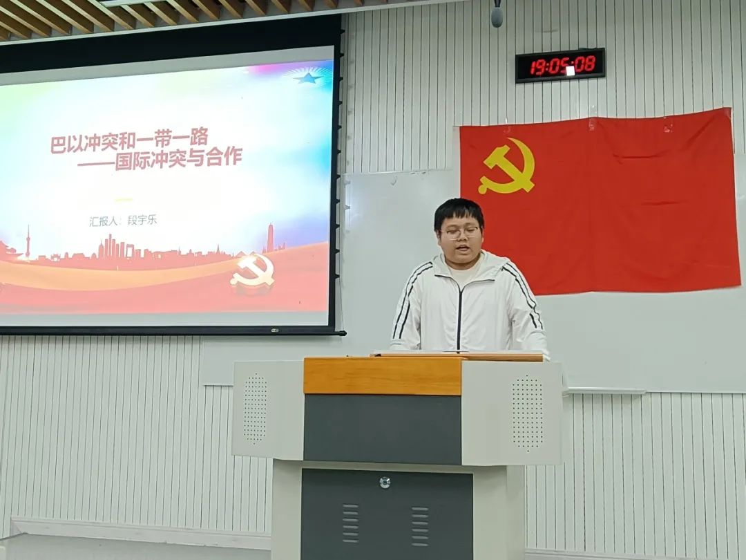 首先,支部成员段宇乐分享了自己对和平与发展时代主题的理解,以巴以冲突为背景,带领大家了解了最新的时事政治,深刻体会感悟和平的可贵和不易,以及推动搭建互通互联有效平台的必要性。