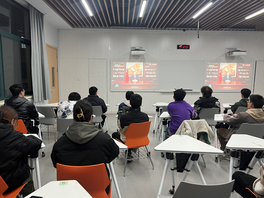 最后,全体参会人员一起收看了习近平主席二〇二四新年贺词实况转播,新年贺词催人奋进,鼓舞人心,不仅表达了对中国人民的亲切问候,更传递了党和政府对人民群众的美好祝福和期望。同学们纷纷表示在新的一年里要继续踔厉奋发、勇毅前行,以更加昂扬的精神状态投入到学习中去,共同创造更加美好的未来。