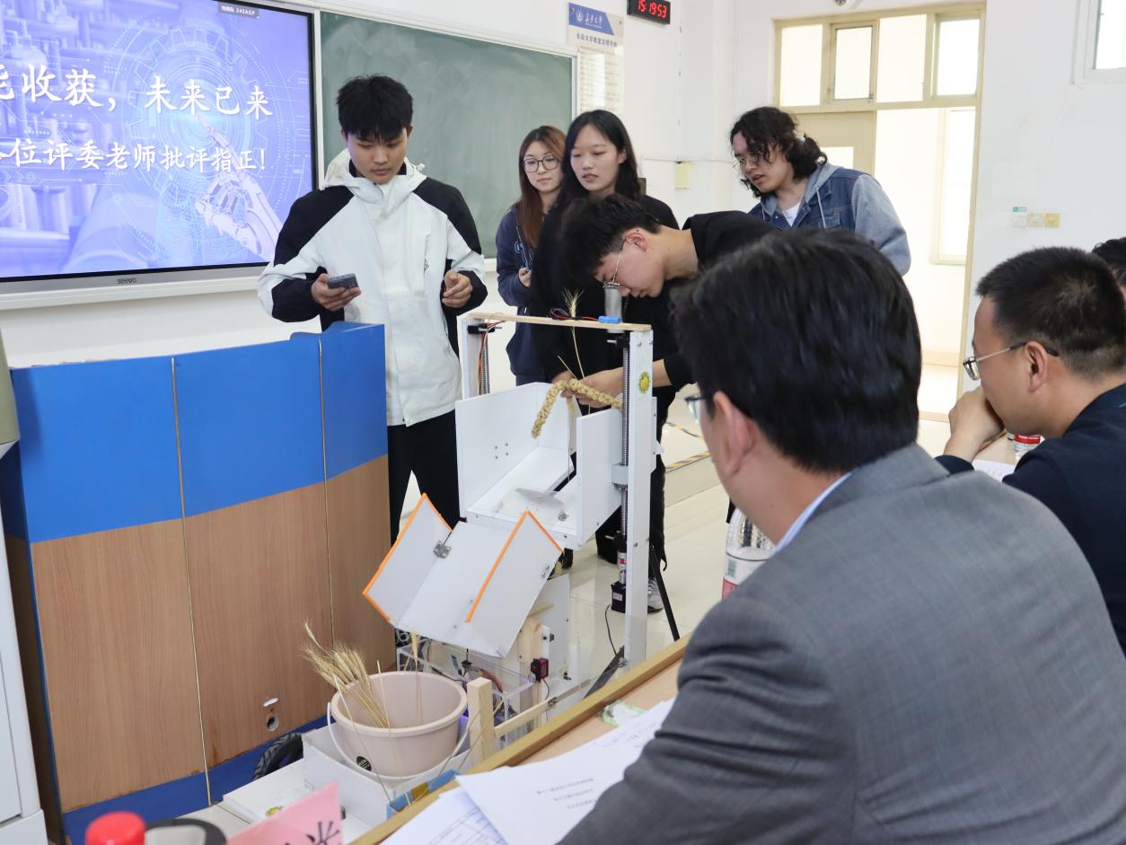 本次参与比赛答辩的项目有“仿生青蛙”、“青菜自动收割机”、“白菜播种机械”、“谷子智能收割机”、“莲藕采收一体化机械”等20个项目。项目答辩人从项目背景、研究意义、设计方案、工作原理、竞争优势、作品展示、应用前景等方面对项目进行阐述。随后评审老师对项目进行提问、指导,并鼓励参赛团队围绕作品优点进行完善。