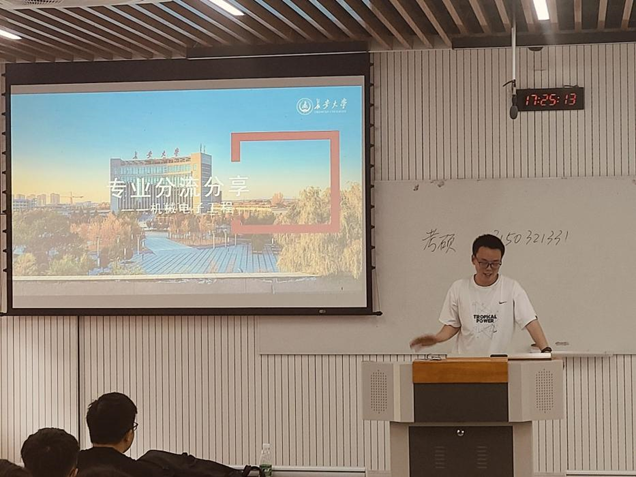 之后,机械工程(交通建设与智能装备)的徐明坤进行了对于自己专业的课程设置以及任课老师的研究方向分享。徐明坤强调,无论选择哪一个专业方向,自身学习成绩一直是放在第一位的。同时,专业分流对于未来的职业发展至关重要,需要认真思考、慎重选择。他也提醒大家在选择专业时,不仅要考虑个人兴趣和优势及时规划好自己保研与考研之间的选择,还要考虑市场需求和行业发展。