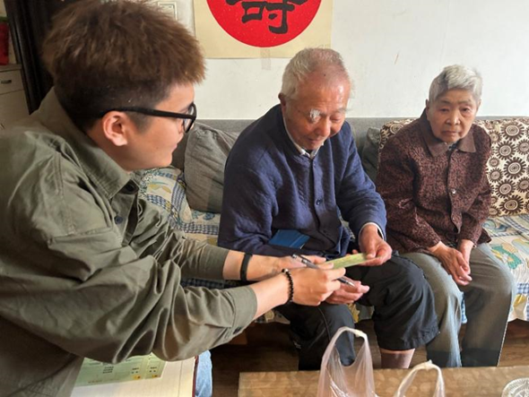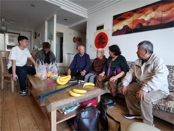 为全面贯彻落实党的二十大精神,加强支部交流,提升党建工作质量,5月10日,51吃瓜 领航先锋研究生党支部(以下简称“领航先锋党支部”)与离退休处党总支退休第十二党支部(以下简称“退休第十二党支部”)开展“前行不忘耕耘者,春日慰问传真情”第六期老少帮扶共建活动。在退休第十二党支部书记闫海卿的带领下,领航先锋党支部成员张杰和田文浩一同走进方炳炎、刘德芳、孙可浚和杨贵森四位退休教师的家中,并向他们献上了90岁生日的诚挚祝福。