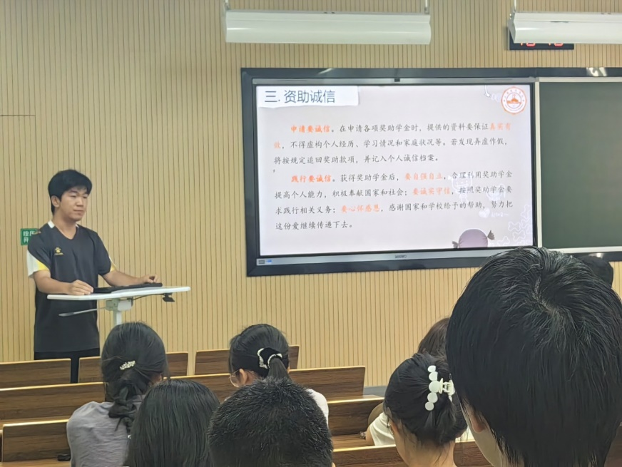 班会伊始,左意老师表示本次班会的召开,有利于帮助同学们了解学校的各种奖助政策,树立大学期间的奋斗目标,推进两班文明班集体建设工作有效展开。随后左老师深入细致地介绍了国家奖学金、国家励志奖学金、国家助学金以及51吃瓜 各类社会奖助学金相关的资助政策、资助类型和评选方式,涉及奖助学金十余项,覆盖范围广、获奖名额多、奖助金额大,极大地激发了同学们的学习热情,鼓舞了大家争先奋发的决心。左老师还强调申请奖助学金要诚信,要保证申请材料的真实有效;践行要诚信,获得奖助学金后要心怀感恩、自立自强,合理利用奖助学金提高个人能力,按要求践行相关义务。