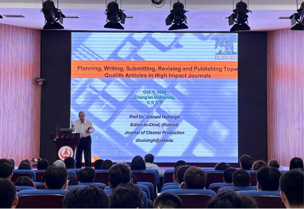 随后,Donald Huisingh教授在南校区东院伯声报告厅为我校师生作2题为《Don't Waste a Good Crisis: Ways to Turn Crises Into Opportunities(不要浪费一场好的危机:将危机转化为机遇)》《How to Plan, Develop, Submit, Revise, and Publish Top Quality Articles in High Impact Journals(如何规划、撰写、投稿、修改高质量论文并发表于高影响期刊)》的学术报告,并与参会师生进行了互动交流。