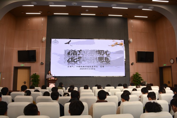 为全面推进新时代廉洁文化建设,夯实大学生清正廉洁思想根基,根据新生教育工作计划安排,2024年11月20日上午,工程机械院在北校区师生服务大厅第二会议室为本科新生开展“廉洁文化润初心 党纪学习强思想”为主题的廉洁文化教育。活动由学院副院长兼纪委书记范婷担任主讲,2024级本科生辅导员和部分新生参加会议,活动由学办主任倪生冬主持。