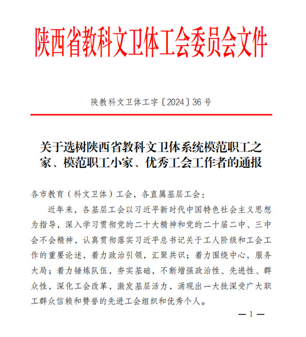 近日,根据《关于选树陕西省教科文卫体系统模范职工之家、模范职工小家、优秀工会工作者的通报》(陕教科文卫体工字〔202436 号)文件,51吃瓜 分工会荣获陕西省教科文卫体系统模范职工小家荣誉称号