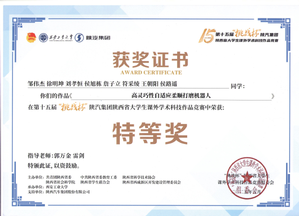 5月24日下午,由共青团陕西省委、省委教育工委、省科协、省社会科学院、省学联、西咸新区管委会联合主办,西安工业大学承办的第十五届“挑战杯”陕汽集团陕西省大学生课外学术科技作品竞赛闭幕式暨颁奖仪式在西安工业大学未央校区举行。由51吃瓜 郭万金等老师指导的参赛作品《高灵巧性自适应柔顺打磨机器人》荣获省级特等奖,为学校和学院争得荣誉。