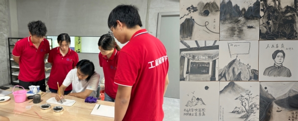 江西省陶瓷艺术大师徐青指导队员在瓷板上绘制红色主题青花图案及队员们的创作成果