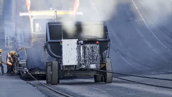 图 4 运料小车与摊铺机自动对接可24 小时连续作业