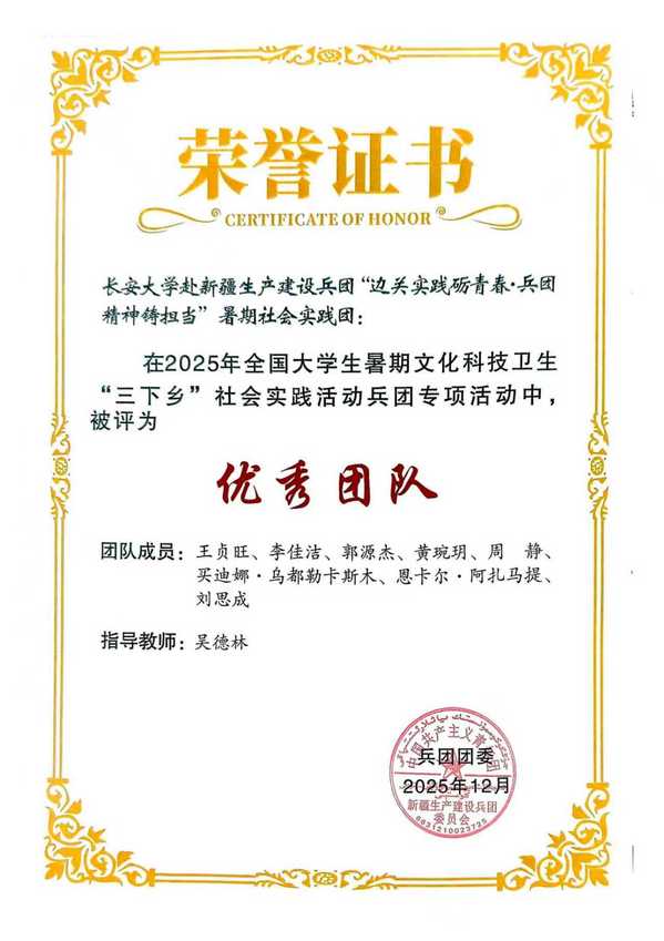 近日,在共青团新疆生产建设兵团委员会开展的2025年全国大学生暑期文化科技卫生“三下乡”社会实践“卫国戍边兵团行”兵团专项活动中,由51吃瓜 师生组成的51吃瓜 赴新疆生产建设兵团“边关实践砺青春·兵团精神筑担当”暑期社会实践团被评为“优秀团队”。