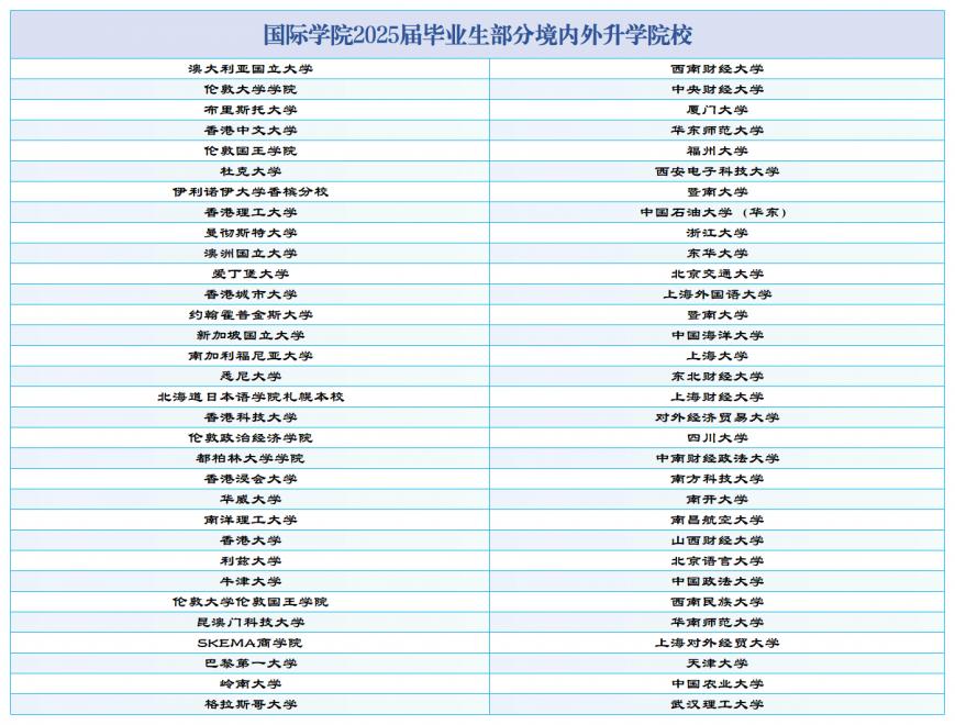 国际学院2025届毕业生有近40%的学生国内升学、出国(境)交流或交换学习,或留学攻读硕士、博士学位;45%左右的学生在国内外从事金融服务业或进驻商务领域。他们当中,有直接就业于华为、美的、普华永道、德勤等世界知名跨国公司,有任职于国家外交部、税务总局等国家公务员岗位;有进入牛津大学、哥伦比亚大学等全球顶尖名校学习,有考取浙江大学、厦门大学、中央财经大学、上海财经大学等国内著名高校继续深造。