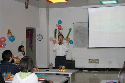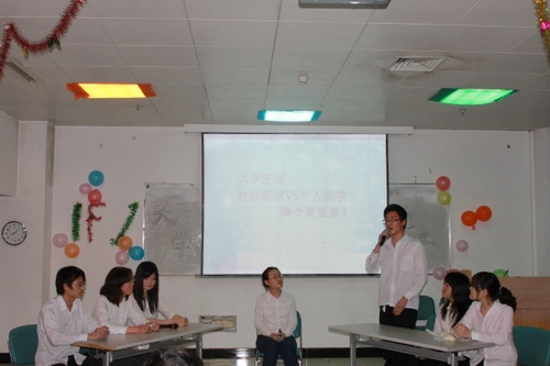 在前面文艺节目过后是一系列学术性的节目,图为同学们精心准备的搞笑辩论的场景