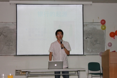 图为陈阳頔同学以诙谐幽默的方式为大家介绍银行的发展史