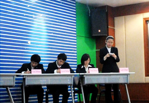 本次决赛的两支队伍分别为法学院和国际学院。经过了激烈的初赛,两个学院的参赛队劈荆斩棘,来到了决赛的现场。外国语学院的曾光湖老师、王静老师,外教Lydia,Jeff,以及国际学院杨梓学姐担任了本次决赛的评委。
